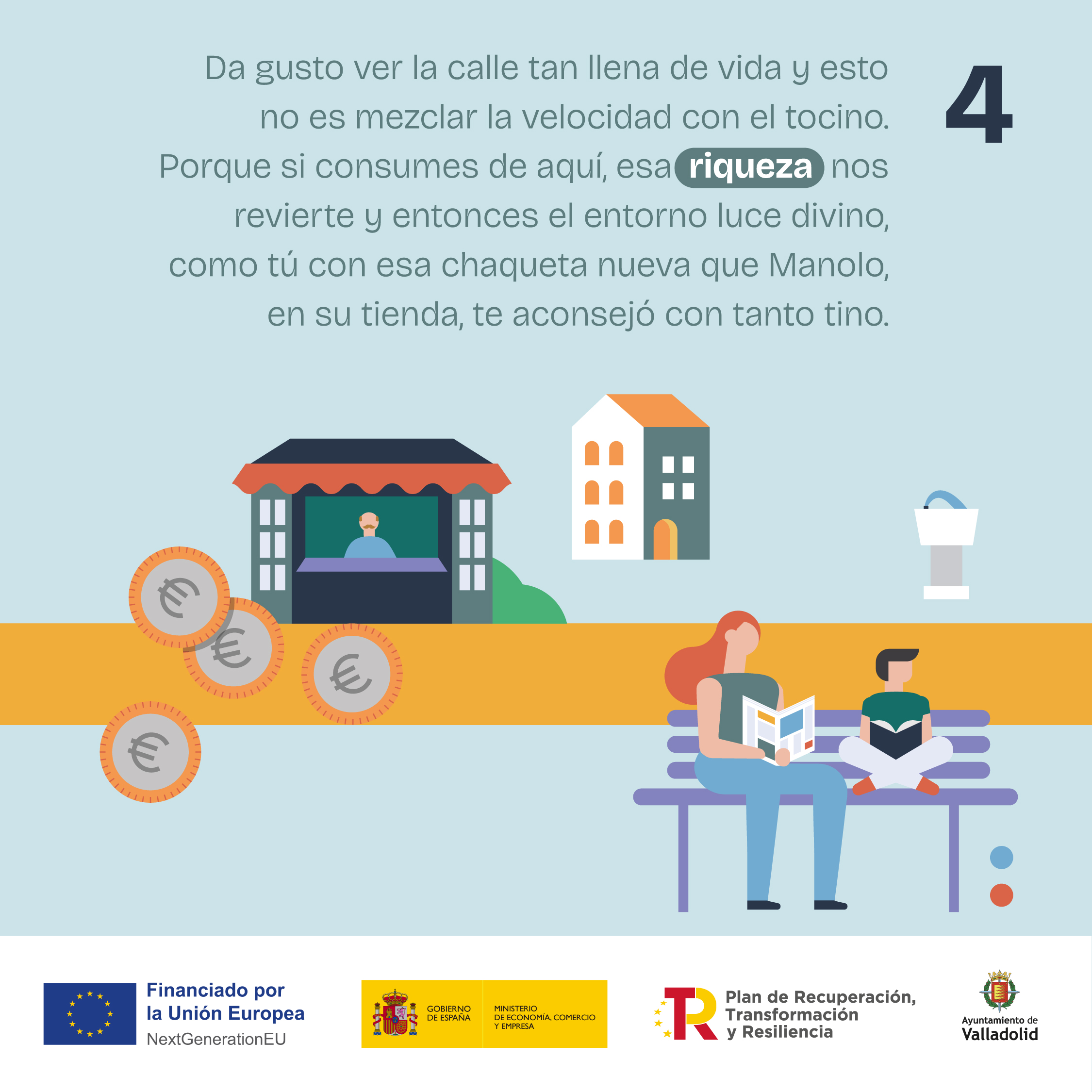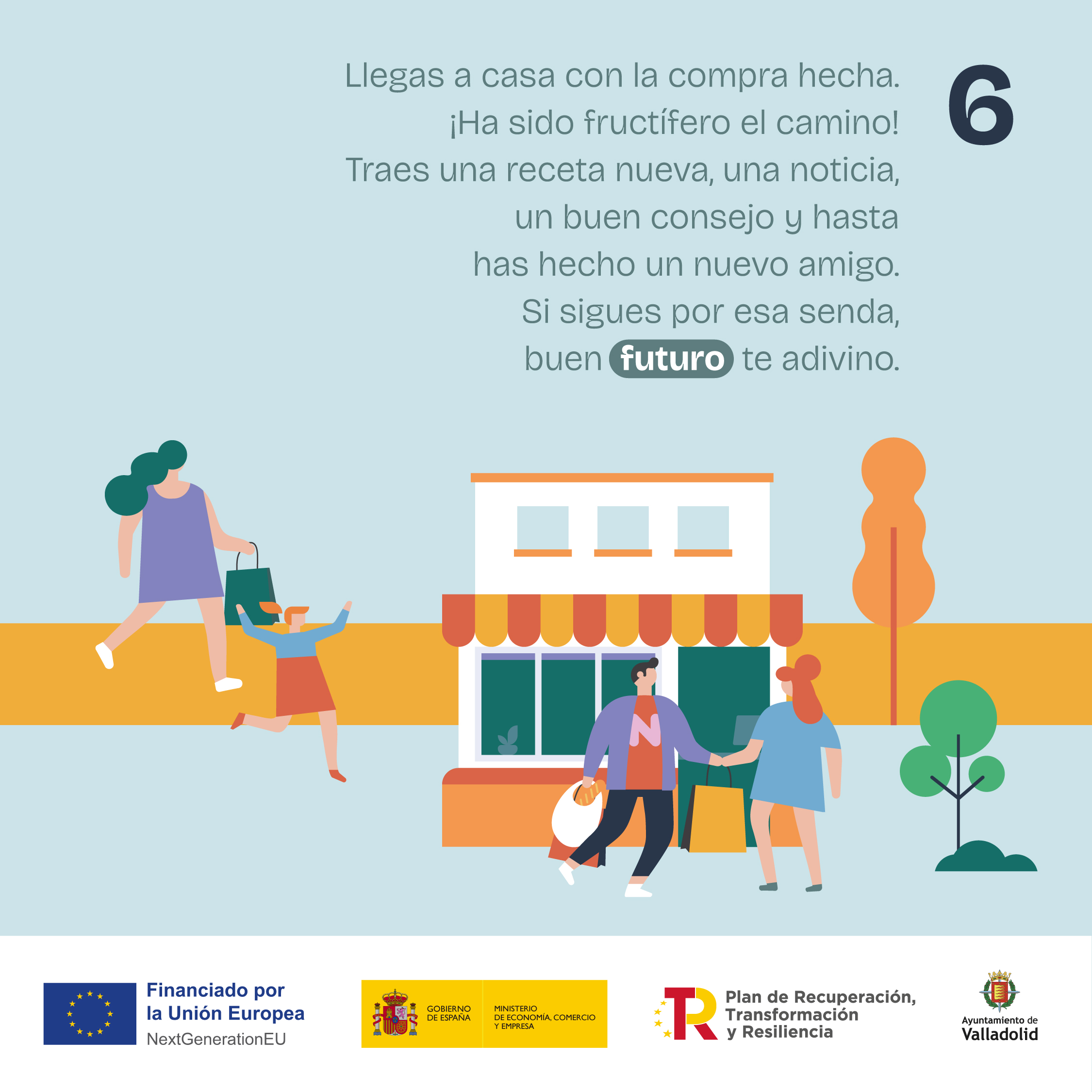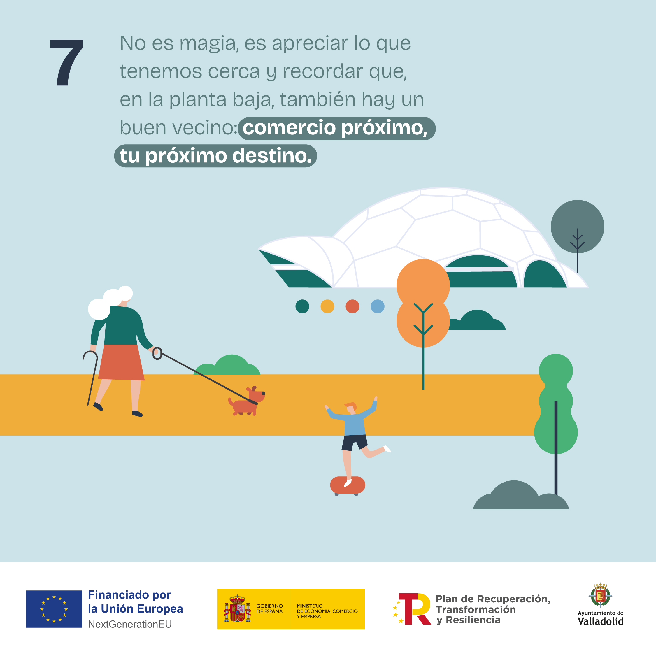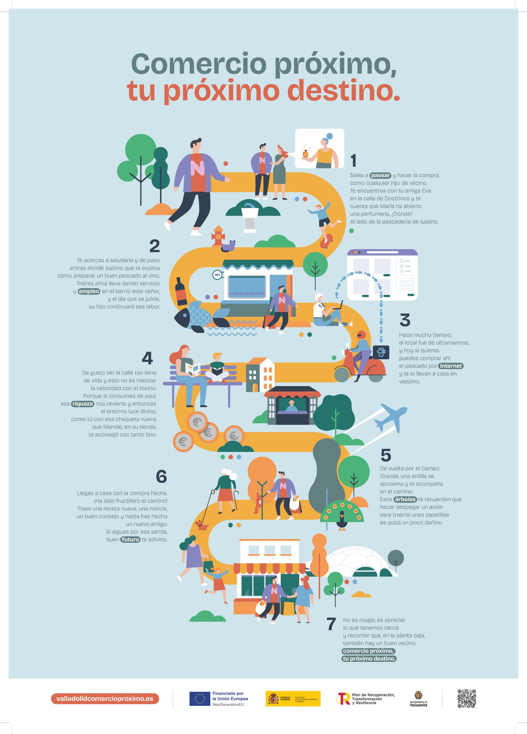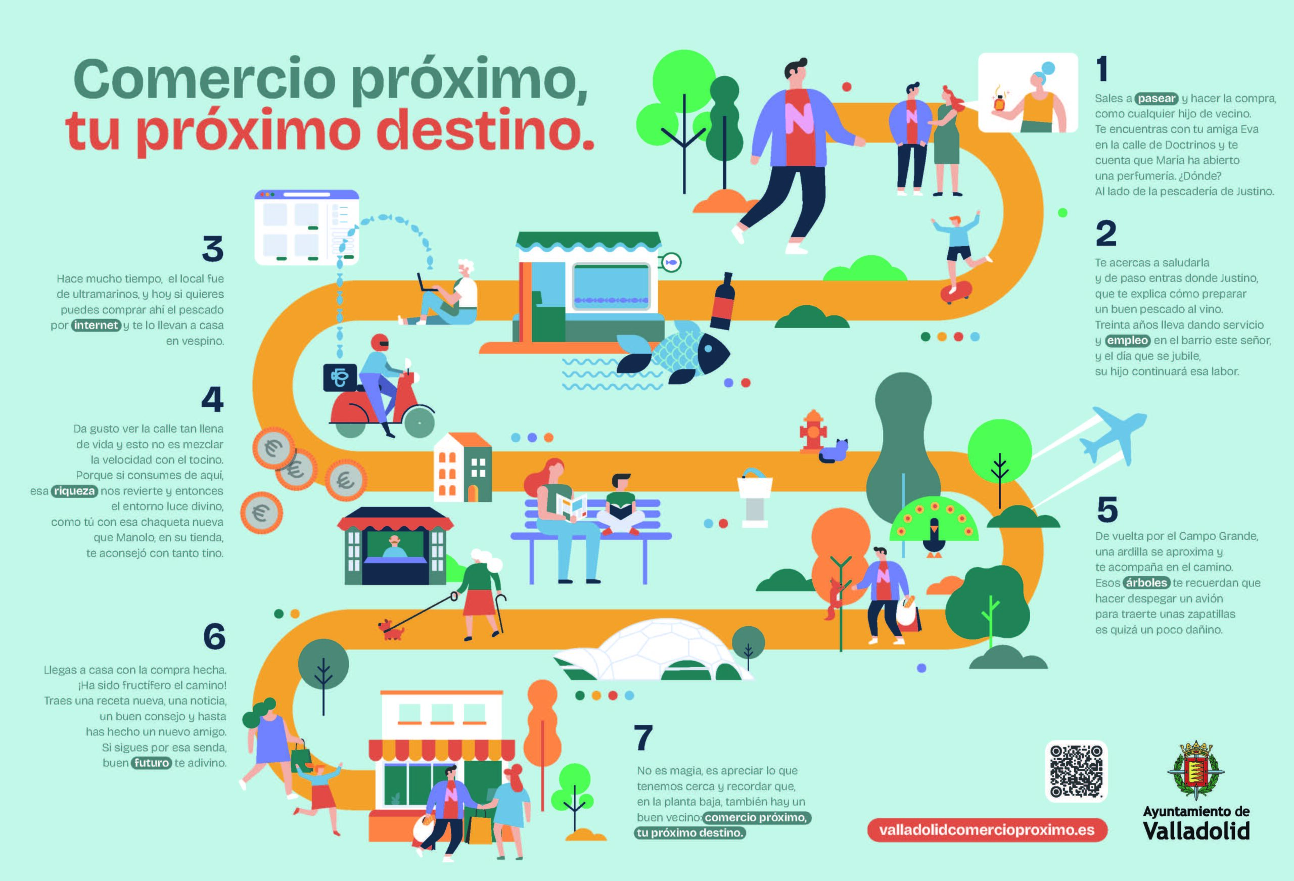 Nueva campaña de comunicación del Ayuntamiento de Valladolid, bajo el lema ‘Comercio próximo, tu próximo destino’, dirigida a animar a la ciudadanía a comprar en el comercio local. El propósito es destacar la contribución del comercio local de Valladolid al desarrollo económico de Valladolid -generando empleo y riqueza que revierte directamente en la ciudad-, así como su valor social como espacio de encuentro y de creación de comunidad, al propiciar una relación cercana entre clientes y comerciantes, a los que presenta como “vecinos de la planta baja”.