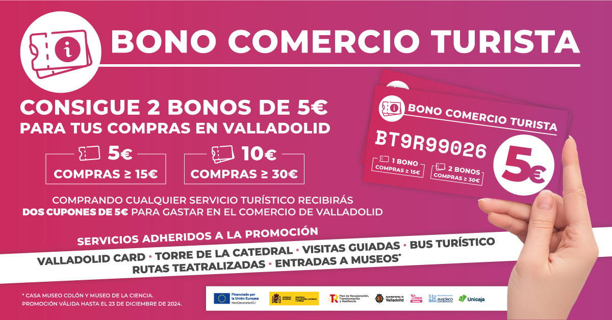 La campaña “BONO COMERCIO TURISTA” se pone en marcha del 22 de noviembre al 23 de diciembre de 2024, con el objetivo de acercar a los turistas y visitantes al comercio local y seguir fomentando el comercio minorista de proximidad. Se trata de una iniciativa del Ayuntamiento de Valladolid a través de su Concejalía de Comercio, Mercados y Consumo, con la colaboración de FECOSVA y AVADECO, que estará cofinanciada con fondos europeos NEXT GENERATION-EU en el marco del Plan de Recuperación, Transformación y Resiliencia, y que cuenta con la colaboración de Unicaja Banco en Valladolid como entidad financiera de gestión.